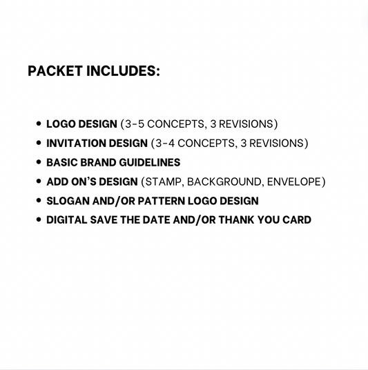 The level you choose depends on how big or small you want to go! Start with our basic packet: a logo and invite combo with design direction, font and color choice dialed in! Or go big or go home with our All Star Packet: and get a full 5 logo suite, invite, save the date with unique and special signage included!